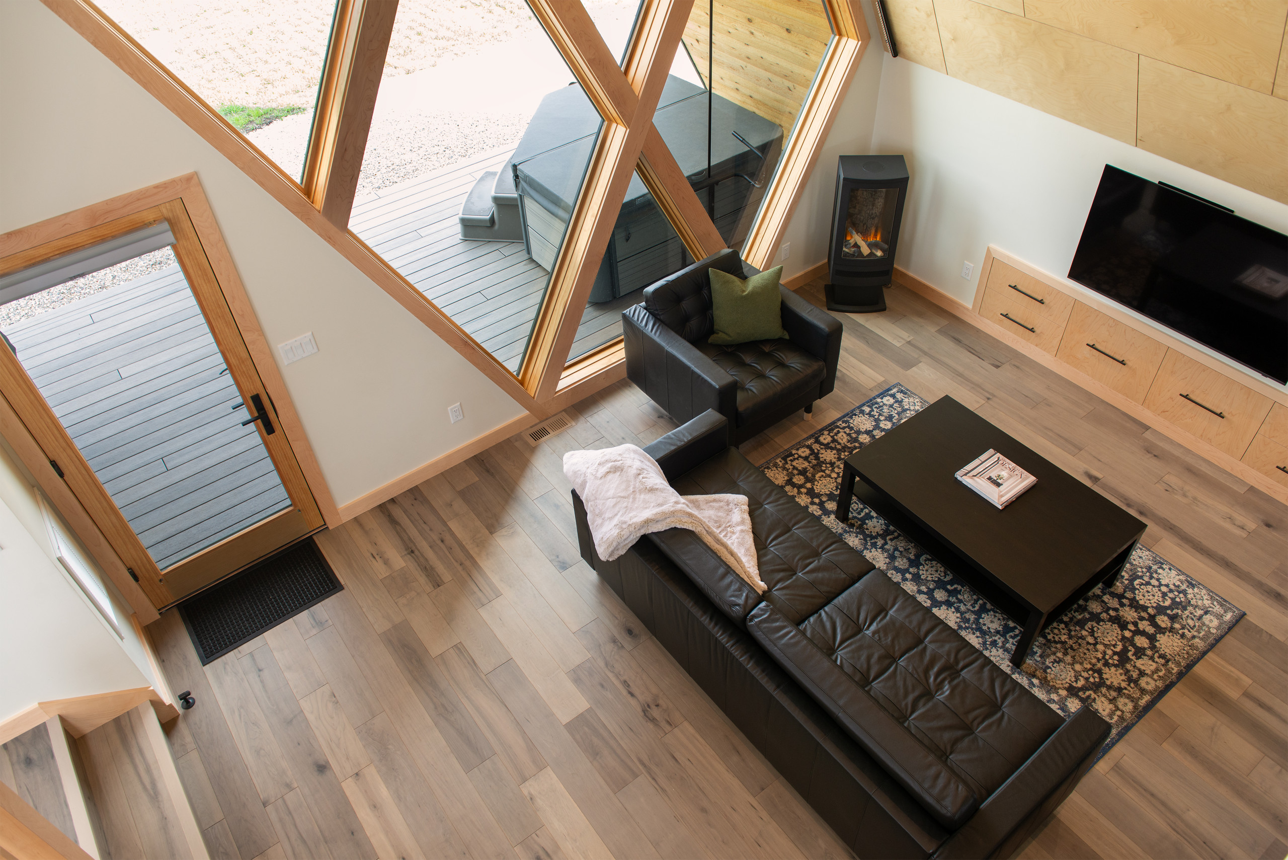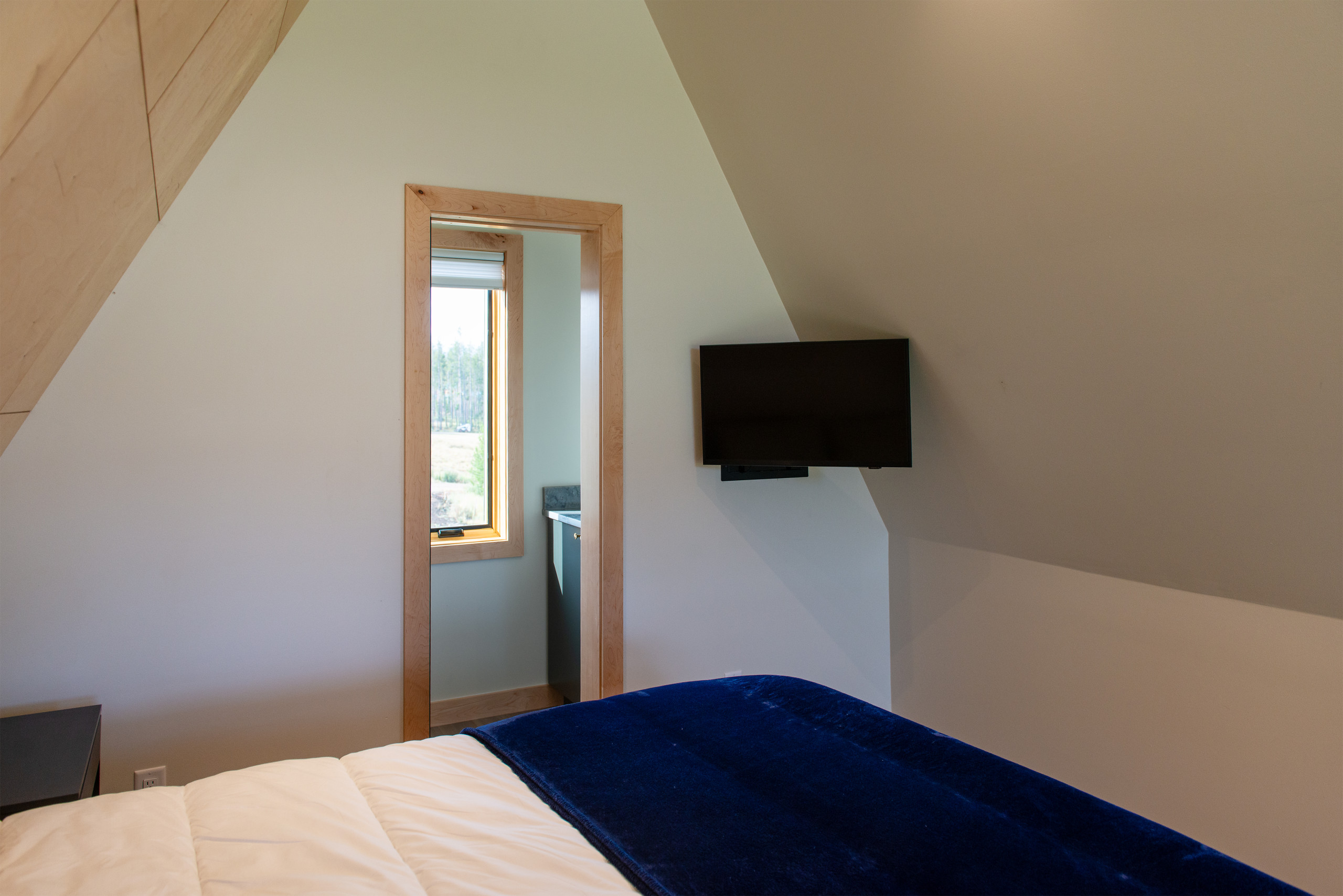 The loft bedroom offers additional stunning views, complemented by a convenient half bathroom. The fully stocked kitchen is perfect for unleashing your culinary creativity, while enjoying your favorite programs on the 55" TV. This cabin comfortably accommodates up to three guests with a pull-out sleeper sofa, making it an ideal tranquil retreat.